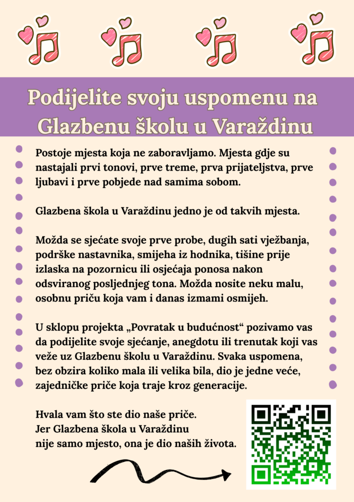 U sklopu projekta „Povratak u budućnost“ želimo prikupiti uspomene svih koji su na bilo koji način povezani s Glazbenom školom u Varaždinu. Pozivamo da svoju priču podijele: sadašnji i bivši učenici, roditelji, bake i djedovi, naši partneri i suradnici, sudionici Erasmus+ projekata, organizacije koje su surađivale s našom školom i svi prijatelji Glazbene škole u Varaždinu!