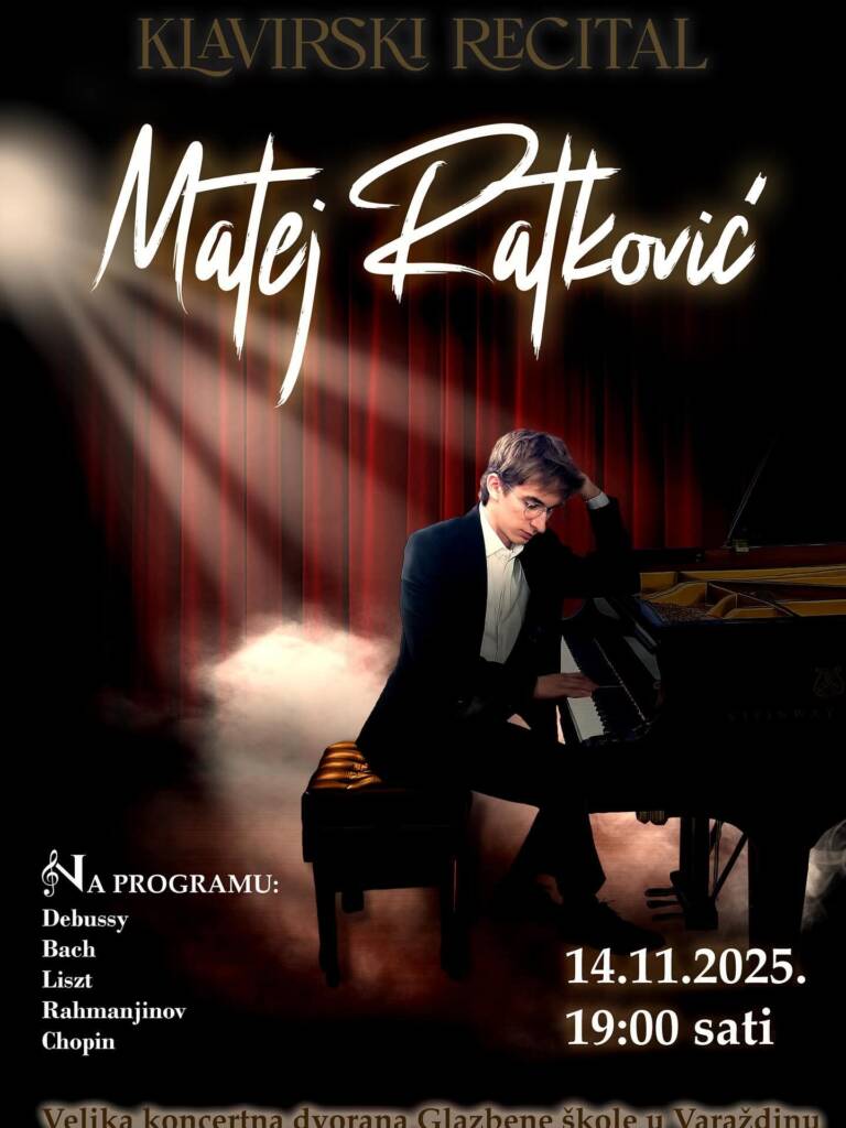 Srdačno vas pozivamo na klavirski recital učenika 2. razreda srednje glazbene škole Mateja Ratkovića, koji će se održati u petak, 14. studenog 2025. godine u 19 sati u Velikoj koncertnoj dvorani škole.